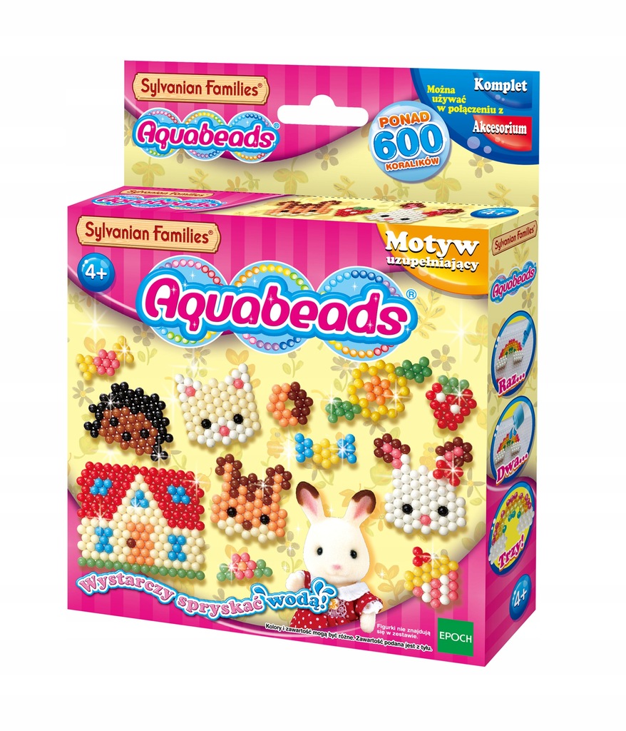 Zestaw uzupełniający Sylvanian Families Aquabeads zawiera 600 podstawowych koralików w 10 kolorach oraz szablony, dzięki którym można zbudować koralikowe postacie, domki i inne elementy magicznej krainy Sylvanian Families. Koraliki do zabaw kreatywnych Aquabeads rozwijają kreatywność i wyobraźnię, ćwiczą koncentrację oraz koordynację ręka-oko, sprawność manualną i małą motorykę, a także rozwijają umiejętność postrzegania barw. Oryginalne zabawki Aqubaeads od EPOCH zapewniają bezpieczną zabawę bez potrzeby użycia żelazka. Koraliki Aquabeads połączą się w magiczny sposób po spryskaniu wodą.