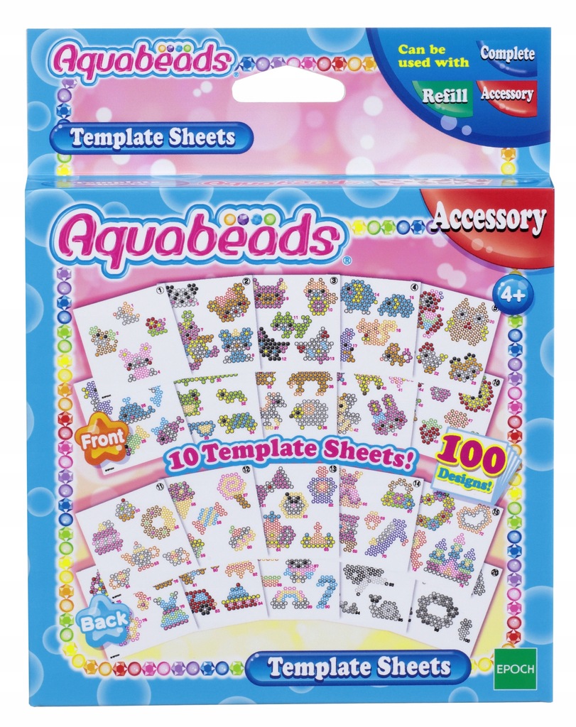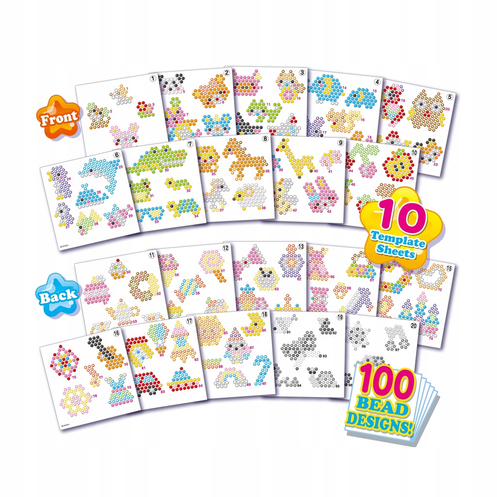 Szablony Aquabeads, to niezbędne wyposażenie dla wszystkich miłośników zabaw kreatywnych z koralikami Aquabeads. Jeżeli jesteś fanem zabawy koralikami Aquabeads, ale już stworzyłaś wszystkie wzory, których szablony posiadasz, zestaw 10 dwustronnych arkuszy z szablonami przedstawiającymi 100 różnych wzorów, zapewnią Ci wiele inspiracji do tworzenia kolejnych kreatywnych dzieł. Zabawa koralikami Aquabeads rozwija kreatywność i wyobraźnię, dzieci ćwiczą koncentrację oraz koordynację ręka-oko, sprawność manualną i małą motorykę, a także rozwijają umiejętność postrzegania barw. Oryginalne zabawki Aqubaeads od EPOCH zapewniają bezpieczną zabawę bez potrzeby użycia żelazka. Koraliki Aquabeads połączą się w magiczny sposób po spryskaniu wodą.