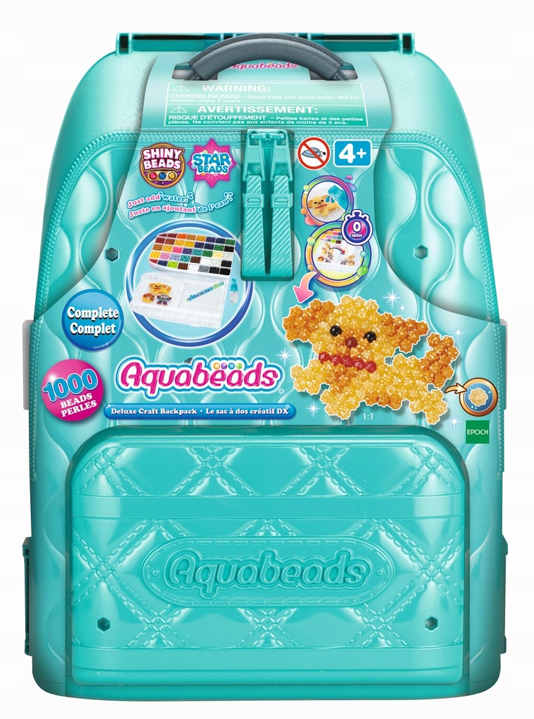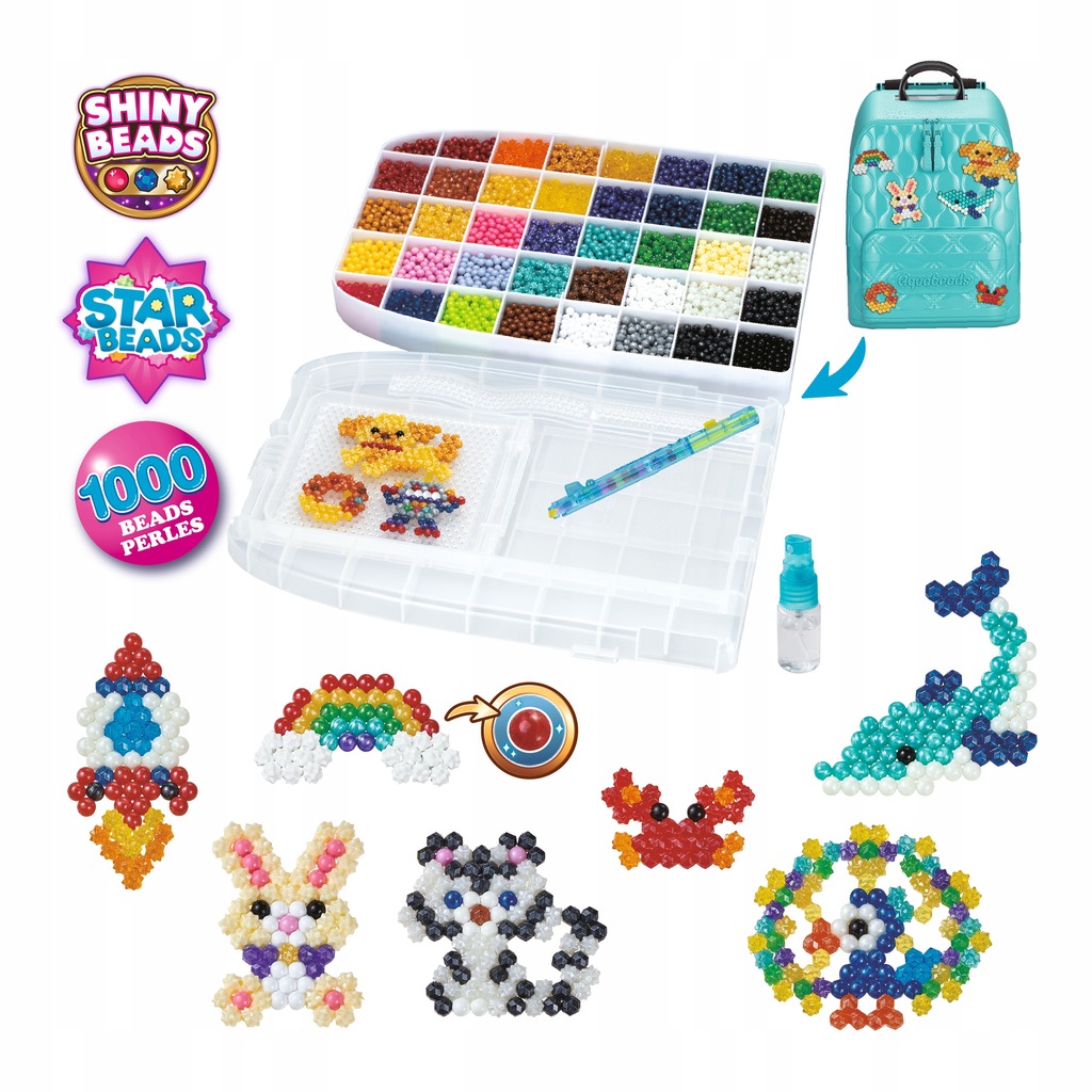 Koraliki Aquabeads – oryginalne od 2004 roku! Zestaw Aquabeads w plecaku to wspaniała zabawa podczas podróży i w domu! Plecak jest wyposażony w dużą paletę, w której można doskonale przechowywać uporządkowane koraliki. W pokrywie palety znajduje się podkładka do układania z systemem Flip Tray, na której bez długiego czekania można tworzyć najróżniejsze figurki. Kolorowe koraliki układa się za pomocą aplikatora 2 w 1 na podkładce, a następnie spryskuje wodą. Po wyschnięciu gotowymi figurkami można ozdobić plecak, przypinając je specjalnymi spinkami. Wspaniały zestaw Aquabeads w plecaku można wszędzie ze sobą zabrać. Zestaw Aquabeads w plecaku zawiera 1000 kolorowych koralików, dużą paletę, podkładkę do układania z systemem Flip Tray, aplikator 2 w 1 i plecak. Produkt przeznaczony dla dzieci od czterech lat.