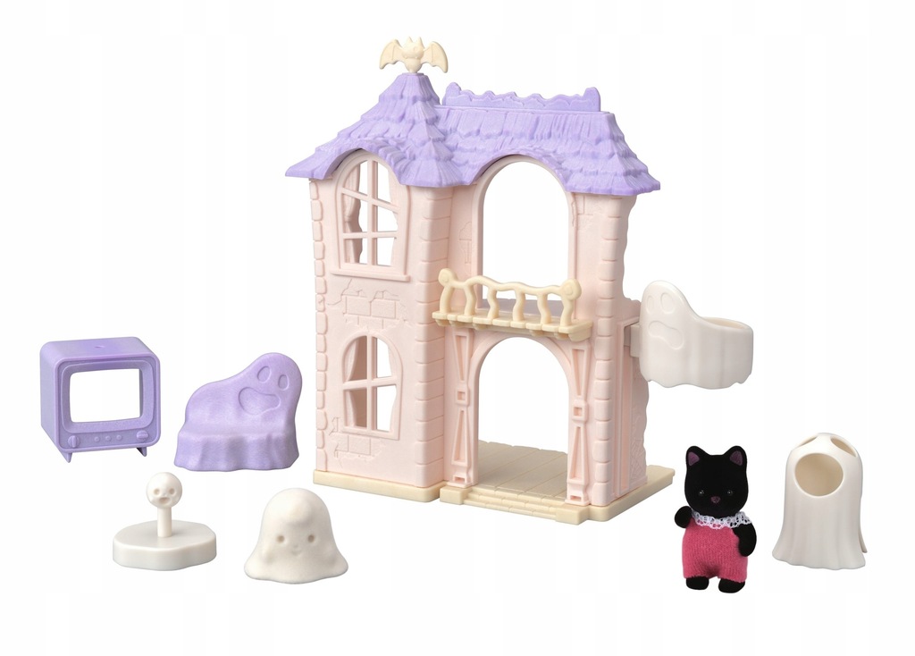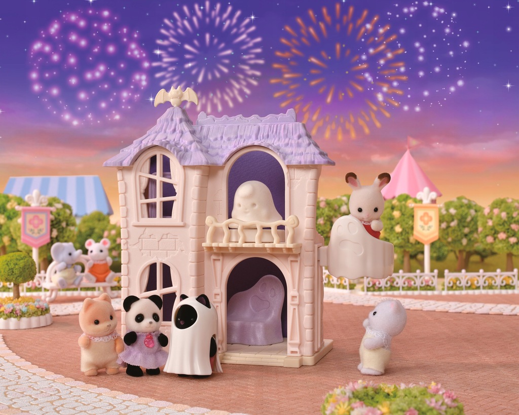 W parku rozrywki Sylvanian Park jest upiornie. W nawiedzonym domu Sylvanian Families naprawdę straszy. Dziecko czarnych kotków przebrało się za ducha i straszy inne dzieci. Z boku domu znajduje się winda, którą można ręcznie wciągnąć na pierwsze piętro. W nawiedzonym domu na gości czeka kiwający się duch, który potrafi się ukryć w telewizorze. Mały nietoperz na dachu chętnie siada na telewizorze i obserwuje świetną zabawę małych zwierzątek. Zestaw „Nawiedzony dom” zawiera nawiedzony dom z windą, fotel w kształcie ducha, telewizor, kiwającego się ducha i dziecko czarnych kotków wraz z kostiumem ducha. Produkt przeznaczony dla dzieci od 3 roku życia.