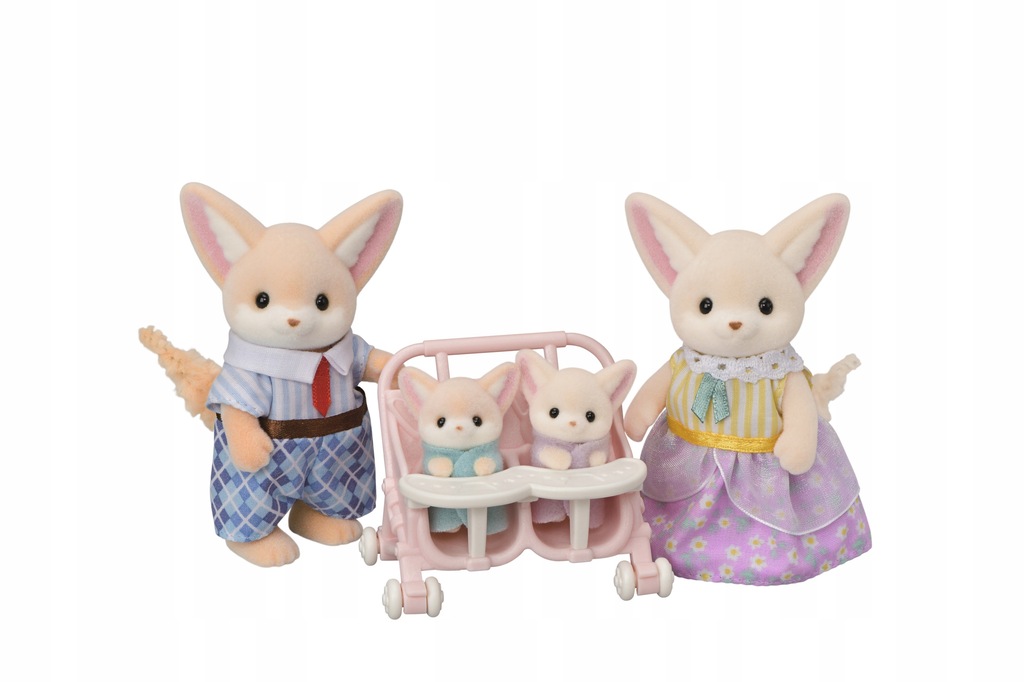 Rodzina lisków pustynnych Sylvanian Families uwielbia piasek. Tata Ronald jest prawdziwym artystą, który z piasku wyczarowuje wspaniałe rzeźby i obrazy. Wystawy jego prac odwiedza wielu miłośników sztuki. Sharon, mama lisek pustynny, jest autorką i ilustratorką. Gdy jej córka Jasmine wymyśli jakąś historię, Sharon tworzy z niej książkę z obrazkami. Mały lisek pustynny Allie to bardzo spokojne maleństwo. Uwielbia siedzieć w swoim wysokim krzesełku i jeść – najchętniej jadłby cały dzień. Kaya, drugi maluch w rodzinie lisków pustynnych, lubi spoglądać w gwiazdy. Zestaw figurek zawiera mamę, tatę, dwoje dzieci i podwójny wózek spacerowy. Głowa, ramiona i nogi dużych figurek są ruchome. Ubranka można zakładać i zdejmować. Rodzina lisków pustynnych Sylvanian Families to aksamitnie miękkie figurki o wielkości od 3 do 8 cm przeznaczone dla dzieci od trzeciego roku życia.