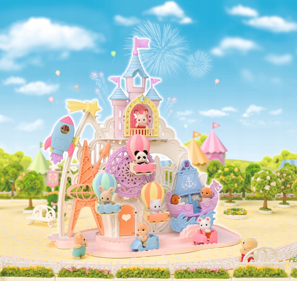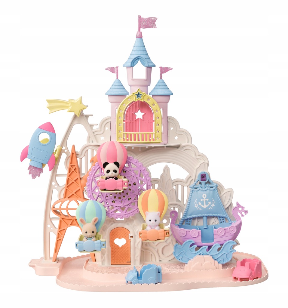 Wesołe Miasteczko Sylvanian Families zapewni mnóstwo atrakcji oraz doskonałą zabawę wszystkim mieszkańcom krainy Sylvania. Dookoła wesołego miasteczka biegnie tor samochodowy, po którym poruszają się minisamochodziki. Wszystkie pojazdy można ze sobą połączyć i stworzyć jeden długi pociąg. Kosmiczna wyrzutnia wystrzeli maluchy w górę, aż do spadającej gwiazdy. Wózki-baloniki na diabelskim młynie zmieszczą 3 maluchy. Kolejną atrakcją w parku rozrywki Sylvanian Families jest statek-huśtawka. Maluchy mogą się huśtać do woli. Wystarczy obracać kwiatek znajdujący się na tyłach parku rozrywki, żeby wprawić w ruch diabelski młyn oraz statek-huśtawkę. Nad wszystkimi atrakcjami góruje piękny pałac z otwieranymi drzwiami, tarasem i trzema wieżami. Zestaw Wesołe miasteczko Sylvanian Families zawiera pałac, kosmiczną wyrzutnię, diabelski młyn, statek-huśtawkę, tor samochodowy oraz 3 figurki małych, uroczych zwierzątek dzieci z rodzin Pandy, Perskich kotków i Biszkoptowych królików. Figurki pokryte są mięciutkim, jedwabistym futerkiem. Zestaw Wesołe miasteczko można połączyć z innymi zestawami, domkami i pojazdami Sylvanian Families. Zabawki Sylvanian Families wyróżnia najwyższa jakość wykonania oraz miłość do szczegółów. Figurki mają ruchome główki, rączki i nóżki.