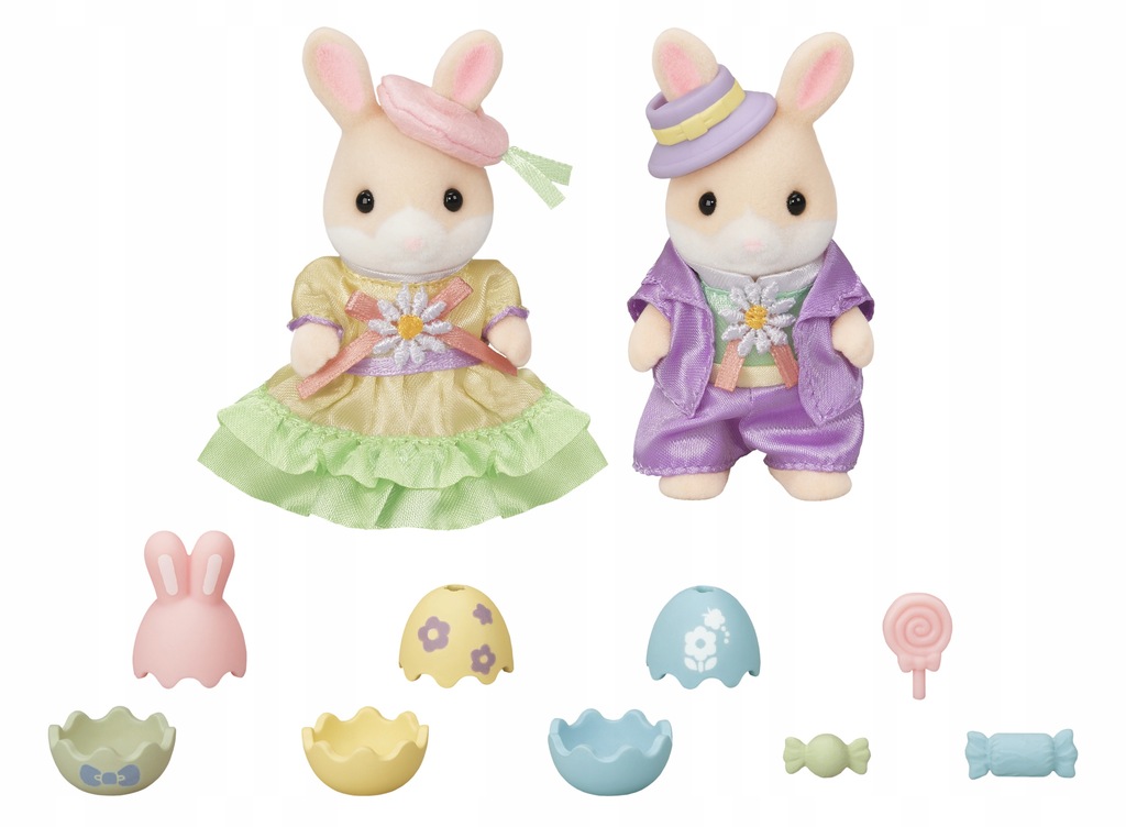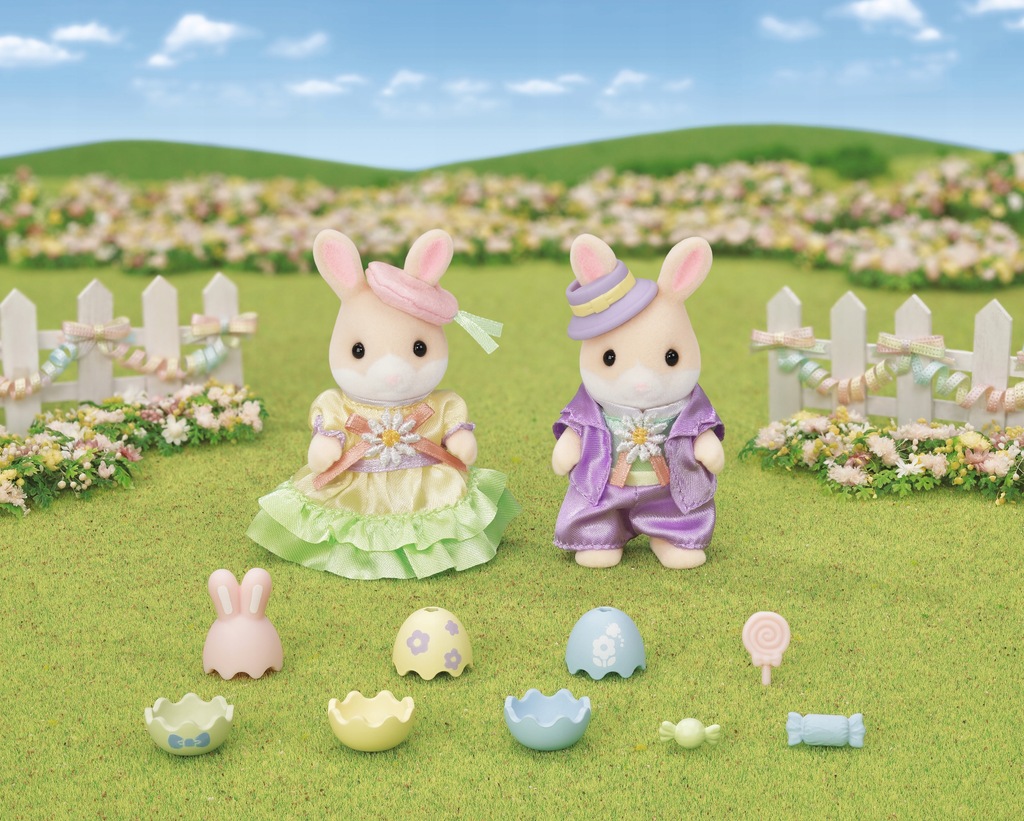 Dzieci z rodziny margaretkowych zajączków uwielbiają Wielkanoc i nie mogą się już doczekać ukrywania jajek. Wkładają do jajek drobne słodycze i w lesie nieopodal Sylvanian Village wyszukują miejsca, w których można je ukryć. Zestaw „Wielkanoc” Sylvanian Families zawiera trzy otwierane jajka, trzy słodkie niespodzianki (nie do jedzenia) i dwie figurki margaretkowych zajączków. Głowa, ramiona i nogi dużych figurek są ruchome. Ubranka można zakładać i zdejmować. Wielkość figurek ok. 6 cm. Produkt przeznaczony dla dzieci od 3 roku życia.