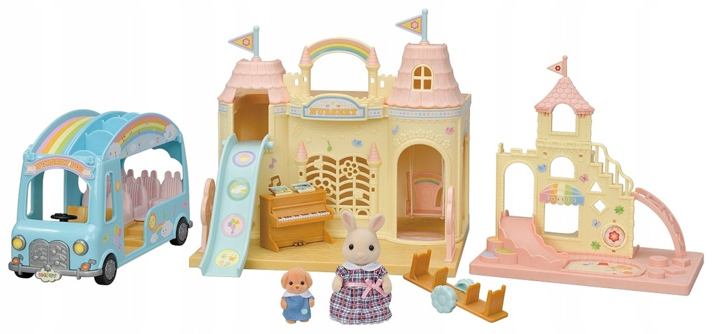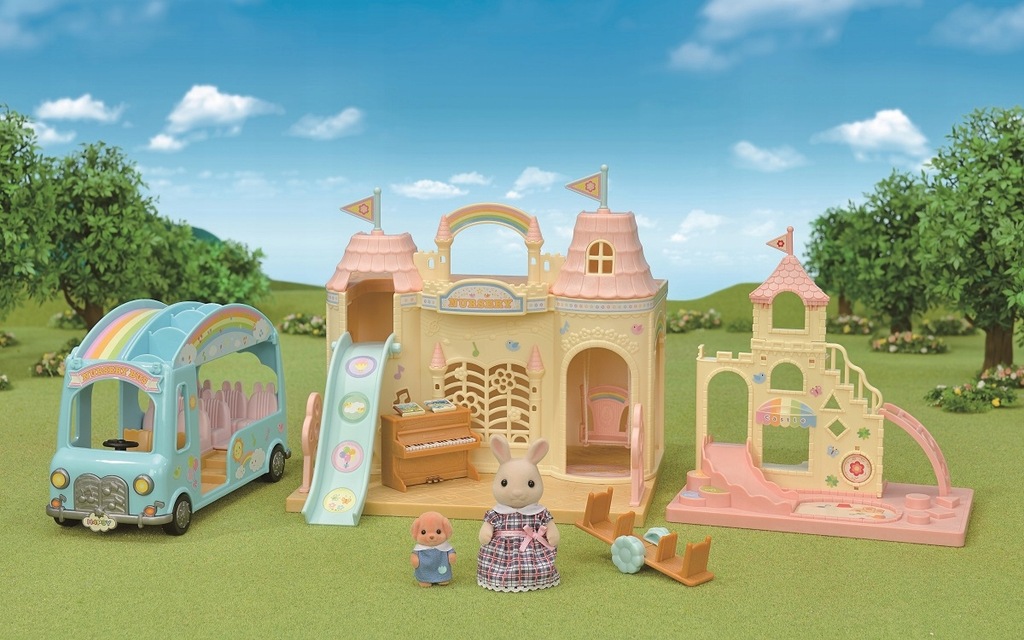 W zamkowym przedszkolu Sylvanian Families wszystkim dzieciom z rodziny Sylvanian dopisuje humor. Tutaj maluchy mogą szaleć i bawić się cały dzień. Mogą się huśtać, bujać i zjeżdżać na zjeżdżalni. Huśtawkę rownoważnię można przekształcić w stół z dwoma taboretami, przy którym dzieci mogą czytać książki. Zjeżdżalnię można przymocować do zewnętrznej ściany lub ustawić osobno na stojakach. Przedszkole „Zamek” z serii Sylvanian Families ma dwa piętra pełne niespodzianek. Dzieci mogą również uczestniczyć w lekcji muzyki przy fortepianie. Domek można ustawiać na platformie w różnych pozycjach, dzięki czemu jest więcej miejsca na zabawę w środku lub na terenie przed przedszkolem. Chorągiewki, wieżyczki i wnętrze są uroczo ozdobione licznymi detalami. W zestawie jest przedszkole „Zamek”, zjeżdżalnia, huśtawka, fortepian, huśtawka wagowa z możliwością zmiany w stół z taboretami i inne akcesoria. Wymiary (szer. x wys. x gł.): 26 x 25 x 20 cm.